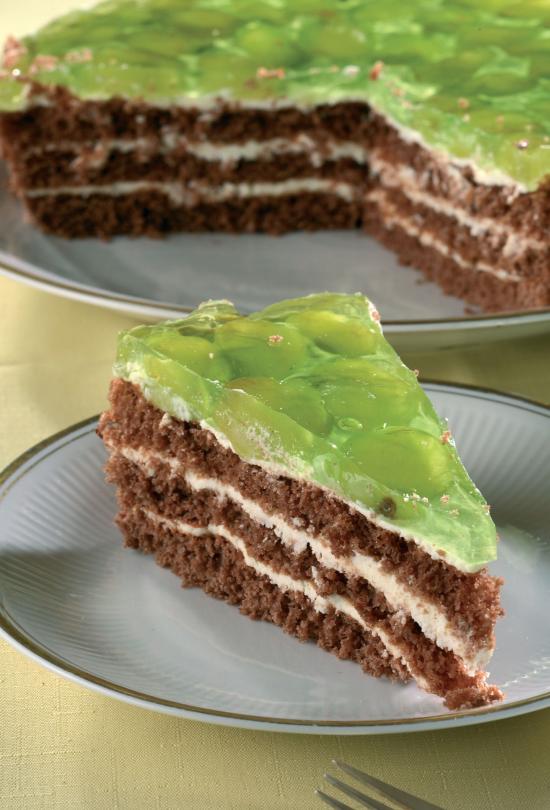 W tortownicy o dopasowanej do blatów biszkoptowych średnicy ułożyć jeden z nich. Wyłożyć na niego 1/3 masy i kolejno pozostałe 2 blaty, smarując każdy masą serową. Uszczelnić kremem przerwę, między tortem a tortownicą. Umyte i osuszone winogrona przekroić na połówki, wyjąć pestki. Ułożyć połówki owoców na wierzchniej warstwie kremu. Wstawić tort na 30 min do lodówki. Galaretkę wykonać według przepisu na opakowaniu, ostudzić, tężejącą wylać na wierzch schłodzonego tortu. Wstawić do lodówki na minimum 2 godz.