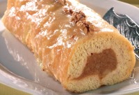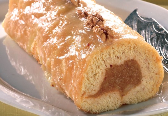 Jabłka udusić jak na szarlotkę i jeszcze gorące wymieszać z 1/2 sypkiej galaretki. Wystudzić. Ostudzone ciasto ostrożnie rozwinąć, posmarować masą jabłkową i ponownie (tym razem bez ściereczki!) ciasno zwinąć. Zastudzić w lodówce (ok. 2 godz.). Przed podaniem udekorować bitą śmietaną lub jasną polewą według przepisu na białą polewę i połówkami orzechów.