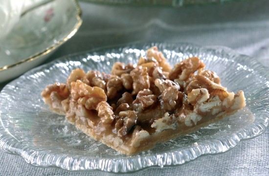 Wafel włożyć na 10 minut do średnio nagrzanego piecyka i obsuszyć (nie spalić!). Stopić masło z miodem i cukrem, wsypać orzechy, wymieszać, smażyć 5 minut. Lekko ostudzić, rozłożyć równomierną warstwą na waflu.