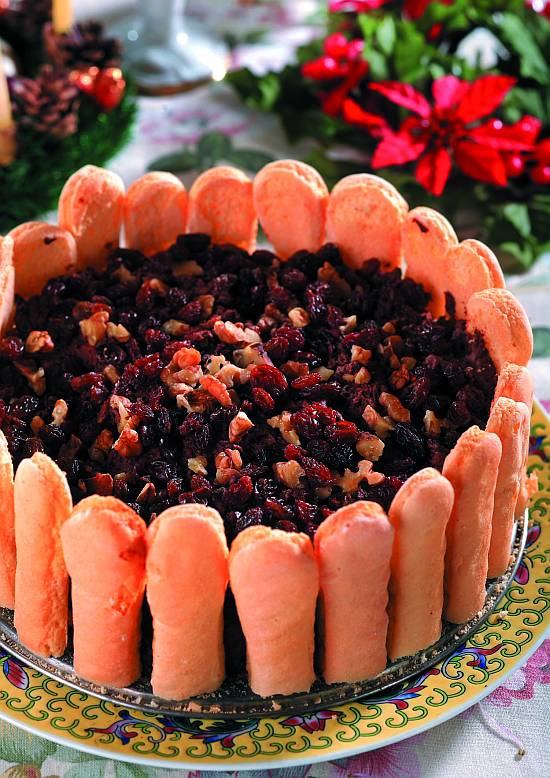 10 biszkoptów grubo pokruszyć i nasączyć alkoholem. Wymieszać z ubitą śmietanką i 2/3 porcji bakalii. Dookoła małej tortownicy ustawić płotek z biszkoptów, wypełnić go przygotowaną masą. Wyrównać powierzchnię i posypać pozostałymi bakaliami, schłodzić i przechowywać w lodówce.