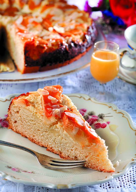 Zmiksować składniki masy serowej i rozłożyć ją na cieście. (Uwaga: masa serowa powinna mieć temperaturę pokojową). Jabłka obrać, pokroić na ćwiartki, a następnie w niezbyt cienkie plasterki. Ułożyć je w dachówkę, kręgami na warstwie serowej. Odstawić w ciepłe miejsce do wyrośnięcia. Piec ok. 50 min w piekarniku nagrzanym do 180°C. Rozgrzać dżem wymieszany z wodą, posmarować nim upieczony wystudzony placek, posypać migdałami lub orzechami.