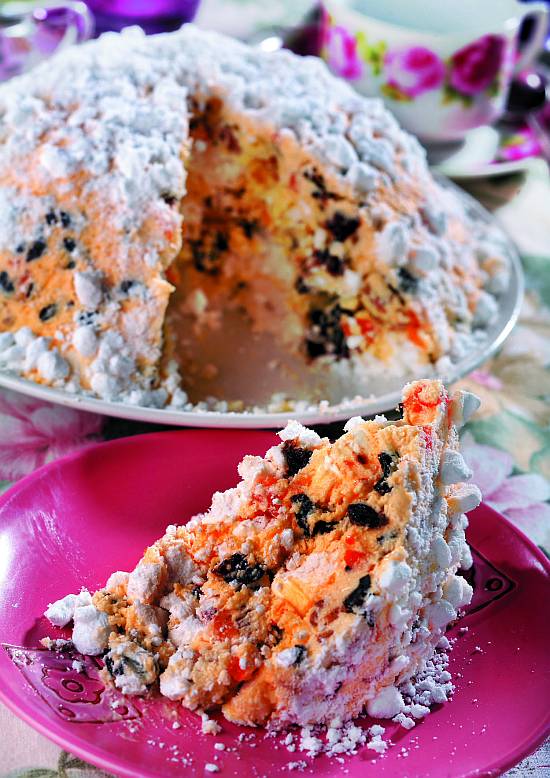 Przed podaniem wyjąć kopiec na talerz, odwracając miskę ostrożnie zdjąć folię i obsypać tort pokruszonymi grubo bezami. Ten tort jest bardzo słodki, nie wszyscy to lubią.