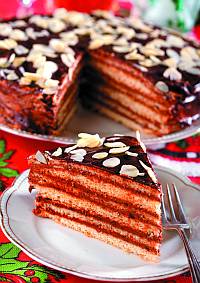 Zrobić masę do przełożenia placków: jaja ubić z cukrem na parze na puszystą, gęstą masę. Dodać połamaną czekoladę i kawę, ubijając rozpuścić je w masie jajecznej. Zdjąć znad pary i ubijać do ostudzenia. Miękkie masło utrzeć na puch, po łyżce dodawać masę czekoladową. Ucierając, a na końcu dodać spirytus. Tą masą przełożyć zimne placki. Wierzchu i boków nie smarować kremem, a polać polewą z czekolady rozpuszczonej z masłem w kąpieli wodnej. Udekorować płatkami migdałowymi.