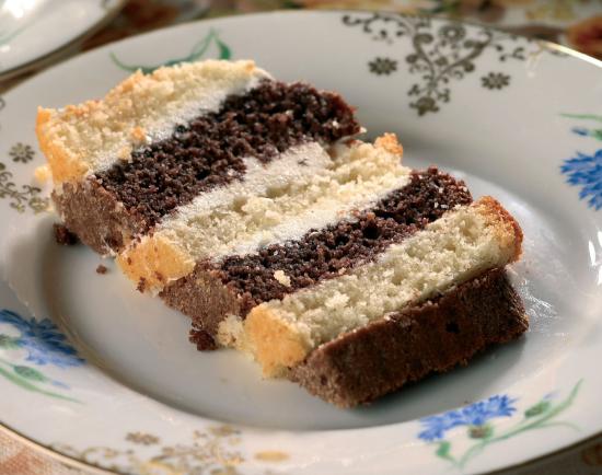 Zrobić i upiec po kolei oba ciasta: żółtka ubić z cukrem i wodą na pulchną masę, wlać olej i jeszcze chwilę ubijać. Stopniowo, przesypując mąką wymieszaną z proszkiem do pieczenia, dodawać ubitą z białek pianę. Do ciasta ciemnego dodać kakao. Ciasto jasne przełożyć do wysmarowanej tłuszczem i obsypanej bułką tartą keksowej wąskiej foremki, wstawić do piekarnika nagrzanego do 180°C i piec ok. 30 min. Podobnie upiec drugie ciasto.