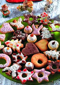 Teraz puścić wodze fantazji, podzielić ciasto na małe części, do jednej dodać przyprawę do pierników, do drugiej kakao, do innych skórkę cytrynową lub pomarańczową, orzechy, rodzynki, migdały. Nadawać ciastkom różne formy: precelków, serc, pierścieni, gwiazdek, aniołków ciąć jak kopytka, lepić jak knedle z owocem z konfitury w środku. Piec ok. 15 minut w piekarniku nagrzanym do 190°C.